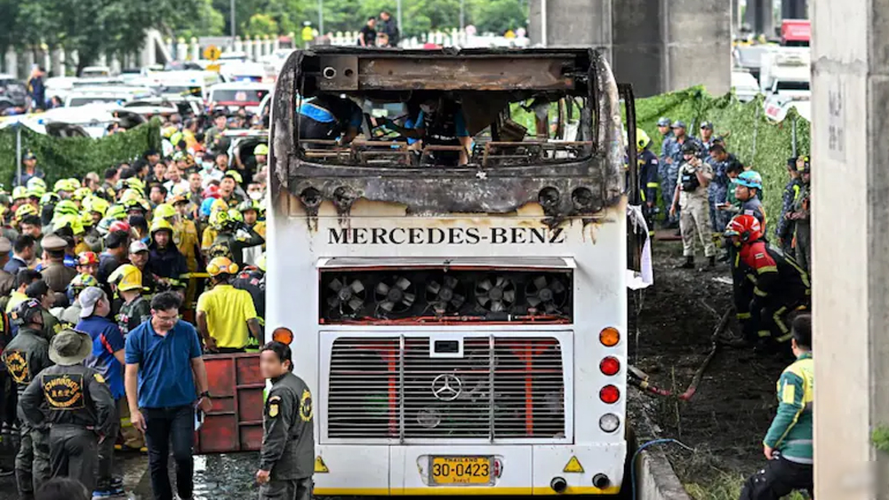 സ്കൂൾ ബസിൽ 44 പേരാണുണ്ടായിരുന്നത്. ഉതായ് താനി പ്രവിശ്യയിൽ നിന്നുള്ള വിദ്യാർത്ഥി സംഘമായിരുന്നു ഫീൽഡ് ട്രിപ്പിനെത്തിയത്. 44 പേരിൽ 38ഉം വിദ്യാർത്ഥികളായിരുന്നു. ടയർ പൊട്ടിത്തെറിച്ചതാകാം അപകടകാരണമെന്നാണ് പ്രാഥമിക നിഗമനം. ടയർ പൊട്ടിയതോടെ നിയന്ത്രണം വിട്ട ബസ് ചെന്നിടിക്കുകയും ഇടിയുടെ ആഘാതത്തിൽ ഇന്ധനടാങ്കിൽ തീപ്പൊരി ഉണ്ടാവുകയും ചെയ്തിരിക്കാമെന്നാണ് വിലയിരുത്തൽ. മരിച്ചവരുടെ കുടുംബാംഗങ്ങൾക്ക് അനുശോചനം രേഖപ്പെടുത്തുന്നതായി തായ്ലൻഡ് പ്രധാനമന്ത്രി പേടോങ്ടാൺ ഷിനവത്ര അറിയിച്ചു. ലോകത്തിലെ ഏറ്റവും മോശം റോഡ് സുരക്ഷയുള്ള രാജ്യങ്ങളിലൊന്നാണ് തായ്ലൻഡ്. ഡ്രൈവർമാരുടെ അശ്രദ്ധയും സുരക്ഷിതമല്ലാത്ത വാഹനങ്ങളും നിരവധി റോഡപകടങ്ങൾക്ക് കാരണമായിട്ടുണ്ട്.