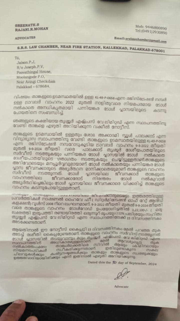 ടോൾ കമ്പനിയായ തൃശൂർ എക്സ്പ്രസ് ലിമിറ്റഡിന്റെ പേരിലാണ് വക്കീൽ നോട്ടീസ് അയച്ചിരിക്കുന്നത്. മുപ്പതോളം വാഹന ഉടമകൾക്ക് ഇത്തരത്തിൽ നോട്ടീസ് ലഭിച്ചതായാണ് വിവരം. പന്നിയങ്കര ടോൾ പ്ലാസയിലൂടെ അനധികൃതമായി സർവീസ് നടത്തിയെന്നും നോട്ടീസിൽ പറയുന്നു. 2022 മാർച്ച് 9 മുതൽ 2024 സെപ്തംബർ ഒമ്പതാം തീയതി വരെയുള്ള കണക്കാണ് നോട്ടീസിൽ പറഞ്ഞിരിക്കുന്നത്.