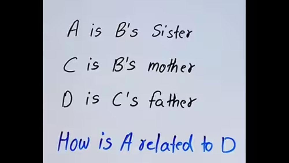ഇതിനുള്ള ഉത്തരം കണ്ടെത്തണമെങ്കിൽ ബന്ധങ്ങളെ കുറിച്ച് അറിയണം. A-യുടെയും B-യുടെയും മാതാവാണ് C എന്നതാണ് ഇതിൽ നിന്ന് മനസിലാക്കേണ്ടത്. A B യുടെ സഹോദരിയാണെന്ന് പറയുന്നതിൽ നിന്നാണ് ഈ ക​ണ്ടെത്തലിലേക്ക് എത്തുന്നത്. D-യെ C-യുടെ അച്ഛനായാണ് അവതരിപ്പിച്ചിരിക്കുന്നത്. അതായത്, A-യുടെയും B-യുടെയും മുത്തച്ഛനാണ് D. ഇവരുടെ മാതാവാണ് C.