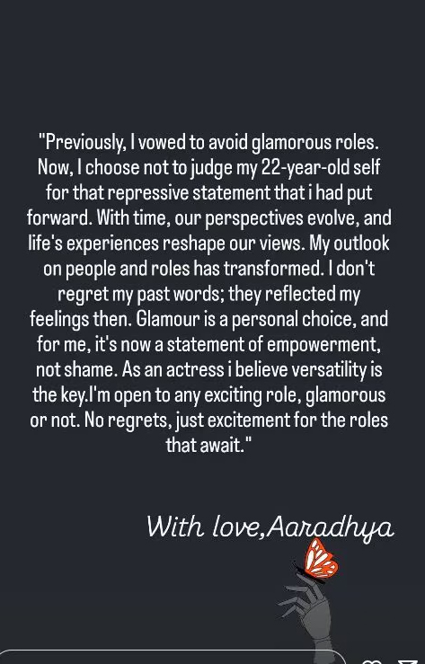 ആളുകളെക്കുറിച്ചും കഥാപാത്രങ്ങളെക്കുറിച്ചുമുള്ള എന്റെ ധാരണകൾ മാറി. പഴയ വാക്കുകളിൽ പശ്ചാത്താപമില്ല. ആ സാ​​ഹചര്യത്തിന്റെ പ്രതിഫലനമായിരുന്നു അവ. ​ഗ്ലാമർ എന്നത് വ്യക്തി​ഗത തിരഞ്ഞെടുപ്പാണ്. എന്നെ സംബന്ധിച്ച് അതാെരു അപകീർത്തിപരമല്ല, മറിച്ച് ശാക്തീകരണമാണ്. ഒരു നടിയെ സംബന്ധിച്ച് വ്യത്യസ്ത കഥാപാത്രങ്ങൾക്കാണ് പ്രധാനം. ​ഗ്ലാമറായാലും അല്ലെങ്കിലും ഏത് റോൾ ചെയ്യാനും ഞാനാെരുക്കമാണ്. മികച്ച കഥാപാത്രങ്ങൾക്കായി കാത്തിരിക്കുന്നു”.—-ആരാധ്യ പറഞ്ഞു.