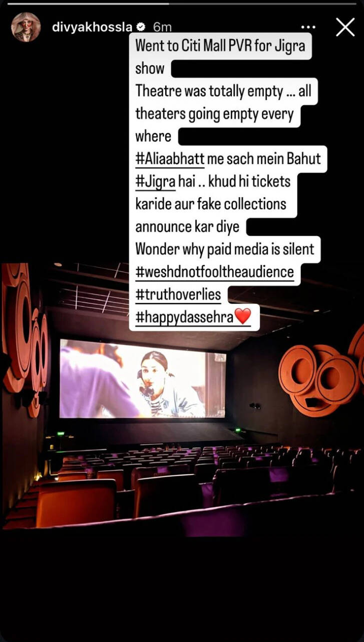 “സിറ്റി മാൾ പിവിആറിലേക്ക് ജിഗ്ര കാണാൻ പോയി, തീയേറ്റർ കാലിയായിരുന്നു. ജിഗ്ര കളിക്കുന്ന എല്ലാ തീയേറ്ററുകളിലെയും അവസ്ഥ ഇതുതന്നെ!”- എന്നായിരുന്നു ദിവ്യയുടെ പോസ്റ്റ്.