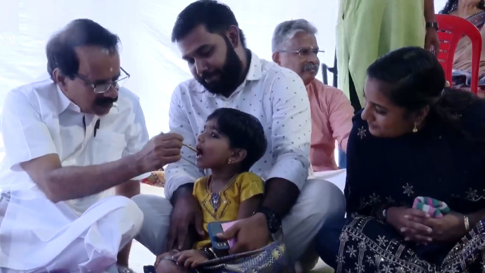 സ്വർണത്തുമ്പുളള നാരായം കൊണ്ട് നാവിൽ ഹരിശ്രീ കുറിച്ച് അക്ഷരദീക്ഷ; കേസരിയിലെ വിദ്യാരംഭ ചടങ്ങിൽ അക്ഷരമധുരം നുകർന്ന് കുരുന്നുകൾ