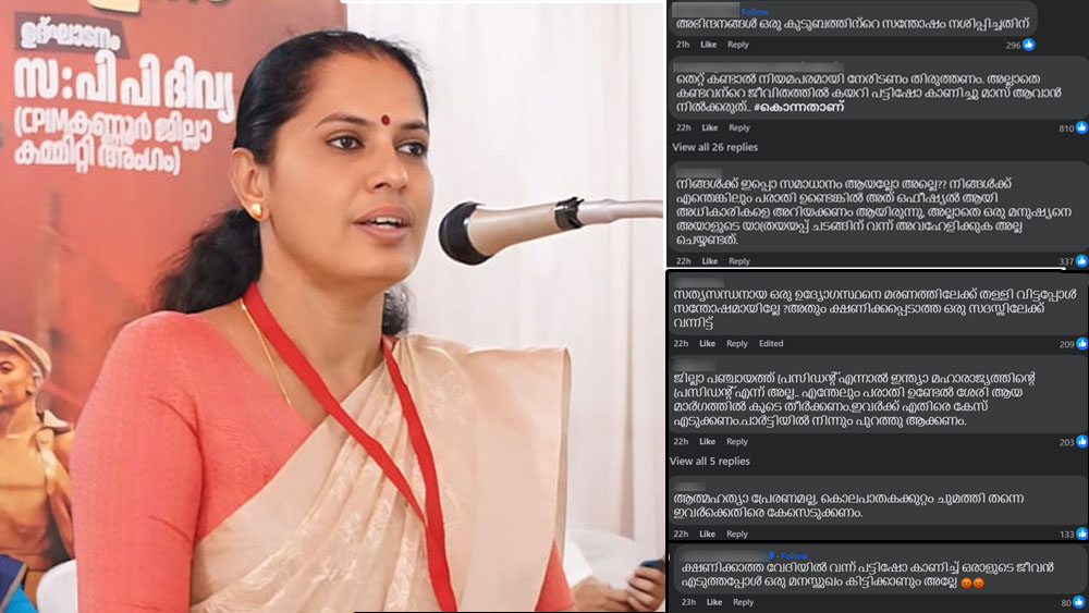 സത്യസന്ധനായ ഒരു ഉദ്യോഗസ്ഥനെ മരണത്തിലേക്ക് തള്ളി വിട്ടപ്പോൾ സന്തോഷമായില്ലേ? അതും ക്ഷണിക്കപ്പെടാത്ത ഒരു സദസിലേക്ക് വന്നിട്ട് എന്നാണ് രോഷത്തോടെ ആളുകൾ ചോദിക്കുന്നത്. ഇവർക്ക് എതിരെ കേസ് എടുക്കണം. പാർട്ടിയിൽ നിന്നും പുറത്താക്കണമെന്നും ആവശ്യപ്പെടുന്നവരുമുണ്ട്. ദിവ്യയ്ക്കെതിരെ ആത്മഹത്യാപ്രേരണക്കുറ്റം അല്ല, കൊലക്കുറ്റം തന്നെ ചുമത്തണമെന്നും ചിലർ ആവശ്യപ്പെടുന്നു. വിളിക്കാത്ത പരിപാടിക്ക് ചെന്ന് എഡിഎമ്മിനെ അപമാനിച്ച ദിവ്യ രാഷ്ട്രീയ ഗുണ്ടായിസത്തിന്റെ എല്ലാ അതിരുകളും ലംഘിച്ചുവെന്നും കമന്റുകളിലുണ്ട്.