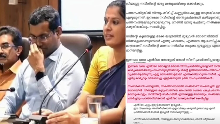 എട്ട് മാസമായി തന്റെ തോളോട് തോൾ ചേർന്ന് പ്രവർത്തിച്ച ആളായിരുന്നു നവീൻ ബാബു, എന്ത് കാര്യവും വിശ്വസിച്ച് ഏൽപ്പിക്കാവുന്ന പ്രിയ സഹപ്രവർത്തകൻ ആയിരുന്നു, നികത്താനാകാത്ത നഷ്ടമാണുണ്ടായത്, എന്നെല്ലാമായിരുന്നു കണ്ണൂർ ജില്ലാ കളക്ടർ കത്തിൽ കുറിച്ചത്.