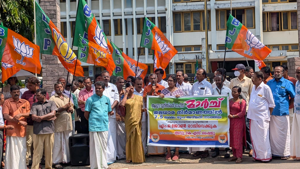 കരാറുകാരനുമായി ചേർന്ന് വൻ സാമ്പത്തിക തട്ടിപ്പു നടത്തിയ ചെയർമാൻ എം ഓ ജോൺ രാജിവെക്കണമെന്ന ആവശ്യമുന്നയിച്ചായിരുന്നു ബിജെപിയുടെ പ്രതിഷേധ മാർച്ച്. ബിജെപി മുനിസിപ്പൽ പ്രസിഡന്റ് ആർ പത്മകുമാർ നയിച്ച മാർച്ച് നഗരസഭാ കവാടത്തിൽ പൊലീസ് തടഞ്ഞു.