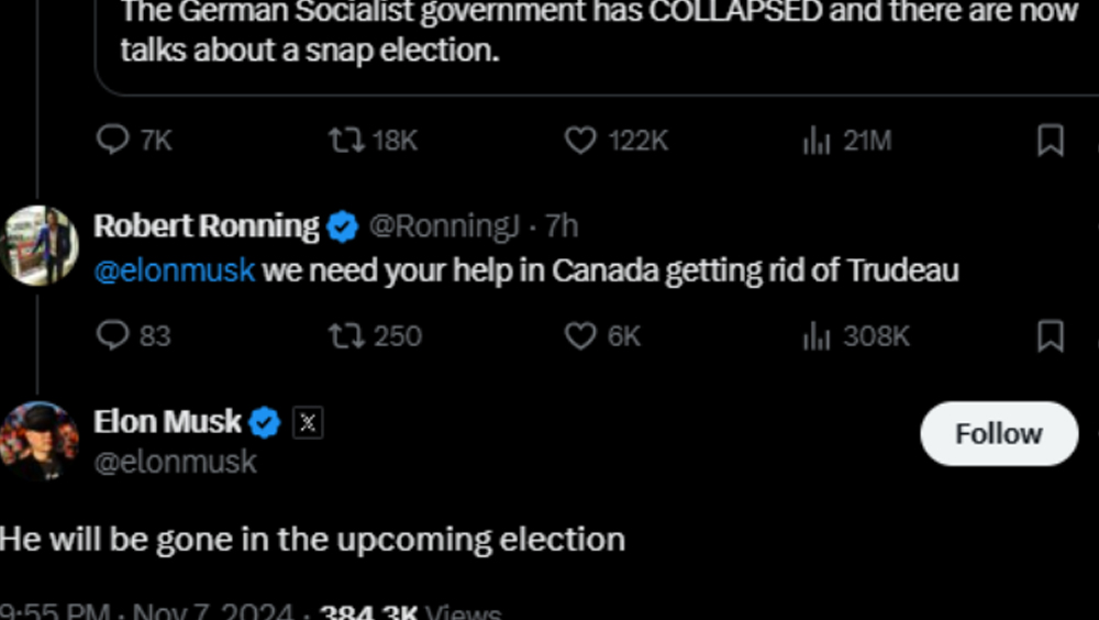 ” വരുന്ന തെരഞ്ഞെടുപ്പിൽ ജസ്റ്റിൻ ട്രൂഡോ പത്തി മടക്കും”- ഇലോൺ മസ്ക് എക്സിൽ കുറിച്ചു. ജസ്റ്റിൻ ട്രൂഡോയുടെ പിടിയിൽ നിന്നും കാനഡയെ മോചിപ്പിക്കണമെന്ന പോസ്റ്റിനോടായിരുന്നു അദ്ദേഹത്തിന്റെ പ്രതികരണം.
