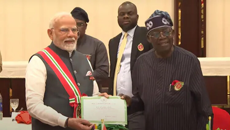 ”നൈജീരിയയുടെ ‘ഗ്രാൻഡ് കമാൻഡർ ഓഫ് ദി ഓർഡർ ഓഫ് നൈജർ’ ബഹുമതി ലഭിച്ചതിൽ അതിയായ സന്തോഷമുണ്ട്. ഇന്ത്യയിലെ 140 കോടി ജനങ്ങൾക്കായും ഇന്ത്യ- നൈജീരിയ സുഹൃദ്ബന്ധം ഉയർത്തിക്കാട്ടുന്നതിനായും ഈ ബഹുമതി ഞാൻ സമർപ്പിക്കുന്നു.”- പ്രധാനമന്ത്രി പറഞ്ഞു.