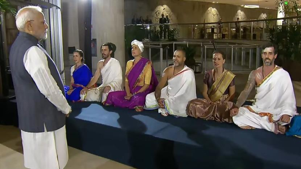റിയോ ഡി ജനീറോ: വേദമന്ത്രങ്ങൾ കൊണ്ട് മുഖരിതമായ അന്തരീക്ഷത്തിൽ പ്രധാനമന്ത്രി നരേന്ദ്രമോദിക്ക് ബ്രസീലിൽ അത്യുജ്ജ്വല വരവേൽപ്പ്. ബ്രസീലിലെ വേദപണ്ഡിതന്മാരുടെ നേതൃത്വത്തിൽ സംസ്കൃതമന്ത്രങ്ങള് ഉരുവിട്ടാണ് നരേന്ദ്രമോദിയെ സ്വീകരിച്ചത്. സ്ത്രീകളും കുട്ടികളും പുരുഷന്മാരുമടങ്ങുന്ന സംഘത്തിന്റെ വേദപാരായണം അതീവ ശ്രദ്ധയോടെ പ്രധാനമന്ത്രി ശ്രവിക്കുകയും ചെയ്തു. പരമ്പരാഗത വേഷവിധാനങ്ങളോടെയായിരുന്നു സ്വീകരണം. ജി 20 ഉച്ചകോടിക്കായാണ് പ്രധാനമന്ത്രി തലസ്ഥാനമായ റിയോ ഡി ജനീറോയിൽ എത്തിയത്.