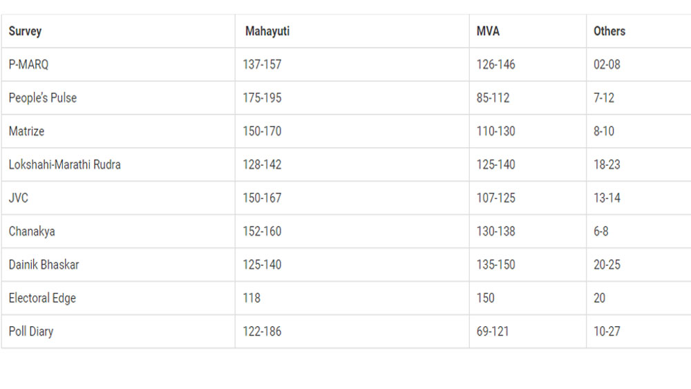 P-MARQ സർവേ പ്രകാരം മാഹായുതി 137-157 സീറ്റും മഹാവികാസ് അഘാഡി 126-146 സീറ്റുകളും നേടുമെന്നാണ് പ്രവചനം. പീപ്പിൾസ് പൾസ് പ്രകാരം 195 സീറ്റ് വരെ മഹായുതി നേടും.