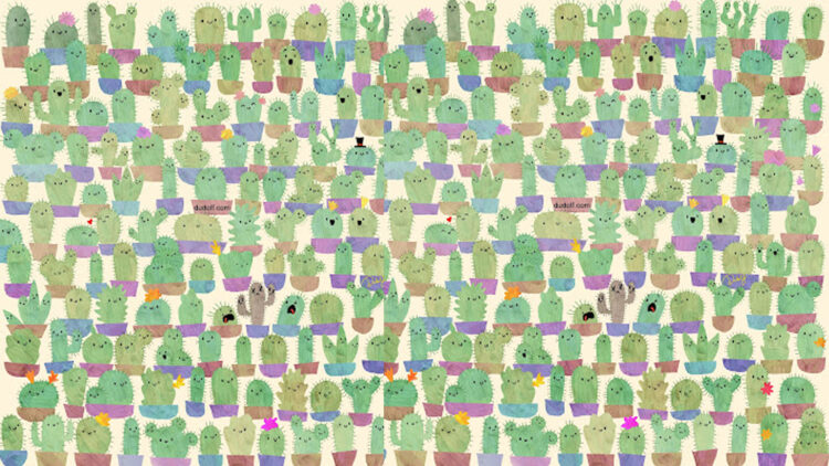 ചിത്രത്തിൽ ആകെയൊരു പച്ചമയം കാണാം. ഈ ഗ്രീൻ ആർമി മറ്റാരുമല്ല, കള്ളിമുൾച്ചെടികളാണ്. വിവിധ നിറങ്ങളിലുള്ള ചട്ടികളിൽ വച്ചിരിക്കുന്ന കള്ളിമുൾച്ചെടികൾ. വ്യത്യസ്ത ഉയരത്തിലും വീതിയിലുമാണ് ഓരോ കള്ളിമുൾച്ചെടിയും നിൽക്കുന്നത്. ചിലതിന് മറ്റേതിനാക്കാൾ ശാഖകളുമുണ്ട്. എന്തായാലും തൊട്ടാൽ കൈ മുറിക്കുന്ന ഈ കള്ളിച്ചെടികൾക്കിടയിൽ പേടിച്ചുവിറച്ച് ഒരു കക്ഷിയിരിപ്പുണ്ട്. ഗ്രീൻ ആപ്പിൾ.. ചിത്രമാകെ പരിശോധിച്ച് കള്ളിച്ചെടികളുടെ ഇടയിൽ നിന്ന് ഗ്രീൻ ആപ്പിളിനെ കണ്ടെത്താമോ?