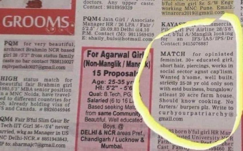30 വയസ്സുള്ള ഫെമിനിസ്റ്റ് യുവതിയ്ക്ക് വരനെ ആവശ്യമുണ്ട് : പ്രായം 28 ൽ കൂടരുത് , 20 ഏക്കർ ഫാം ഹൗസും , ബംഗ്ലാവും വേണം ; പാചകം അറിഞ്ഞിരിക്കണം