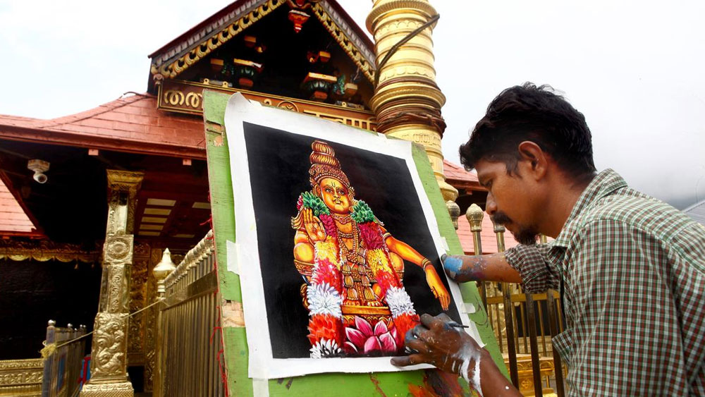 കൊല്ലം പത്തനാപുരത്തിനടുത്തുള്ള ചേക്കാം സ്വദേശിയാണ് 40-കാരനായ മനോജ് കുമാർ. ജന്മനാ വലതു കൈപ്പത്തിയില്ലെങ്കിലും കുറവിനെ മികവുറ്റതാക്കുകയാണ് ഈ കലാകാരൻ. ഇടത് കൈ കൊണ്ട് കലാവൈഭവം സൃഷ്ടിക്കുകയാണ് മനോജ്. തീർത്ഥാടനകാലം ആരംഭിച്ചത് മുതൽ ഇതുവരെ നാല് ചുവർ ചിത്രങ്ങളാണ് മനോജ് കുമാർ പൂർത്തിയാക്കിയത്.