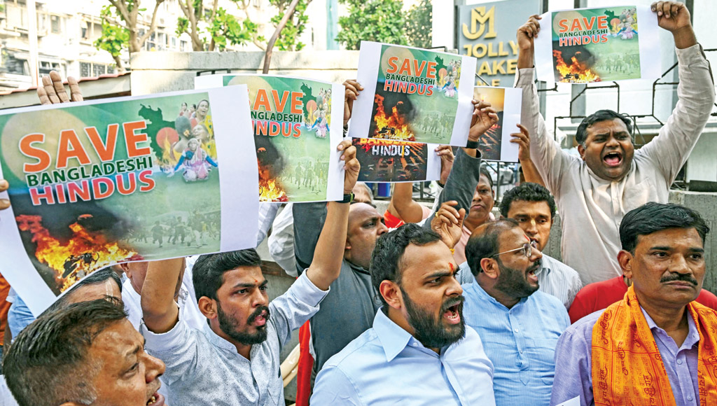 ബംഗ്ലാദേശിൽ നടക്കുന്ന ഹിന്ദു വേട്ടയ്‌ക്കെതിരെ പ്രതിഷേധിച്ച ജനക്കൂട്ടം തിങ്കളാഴ്ച ഉച്ചയ്‌ക്ക്, പോലീസ് ബാരിക്കേഡ് ഭേദിച്ച് സമുച്ചയത്തിലേക്ക് ഇരച്ചുകയറുകയും അതിൽ ഒരു സംഘം അകത്ത് അസിസ്റ്റൻ്റ് ഹൈക്കമ്മീഷണറെ കാണുകയും ചെയ്തു.