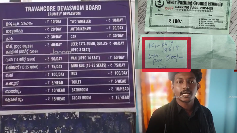ഡിസംബർ രണ്ടിന് വൈകുന്നേരം 6.30-നാണ് എരുമേലിയിലെ വാവർ പാർക്കിംഗ് ഗ്രൗണ്ടിൽ അർജുന്റെ മാരുതി കാർ പാർക്ക് ചെയ്തത്. ദർശനത്തിന് ശേഷം പിറ്റേന്ന് രാവിലെ ഒൻപത് മണിയോടെ തിരിച്ചെത്തി വാഹനമെടുത്തു. വലിയ ബസുകൾക്ക് ഈടാക്കുന്ന 100 രൂപയുടെ പാർക്കിംഗ് പാസിന് പുറകിൽ പാർക്കിംഗ് ജീവനക്കാർ സ്വയം എഴുതി ചേർത്താണ് 500 രൂപ കാറിന് ഈടാക്കിയത്. മലയാളിയായ തന്റെ പക്കൽ നിന്നും ഇത്ര തുക ഈടാക്കിയെങ്കിൽ അന്തർ സംസ്ഥാനങ്ങളിൽ നിന്ന് വരുന്ന ഭക്തരിൽ നിന്ന് എത്ര രൂപയോളമാകും ഈടാക്കുന്നതെന്ന ആശങ്കയും അർജുൻ പങ്കുവച്ചു.