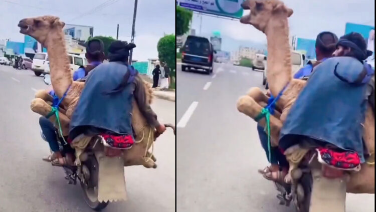 ഒട്ടകത്തിന് സ്ഥലം കൊടുത്തത് പോലെ എന്ന പഴഞ്ചൊല്ല് നാം കേട്ടിരിക്കും. എന്നാൽ ഒട്ടകത്തിന് സ്ഥലം കൊടുത്ത് ബൈക്കിൽ യാത്ര ചെയ്യുന്നവരെ കണ്ടിട്ടുണ്ടോ? എങ്കിൽ അത്തരമൊരു കാഴ്ചയ്ക്കാണ് ഇപ്പോൾ സമൂഹമാദ്ധ്യമ ഉപയോക്താക്കൾ സാക്ഷ്യം വഹിക്കുന്നത്.