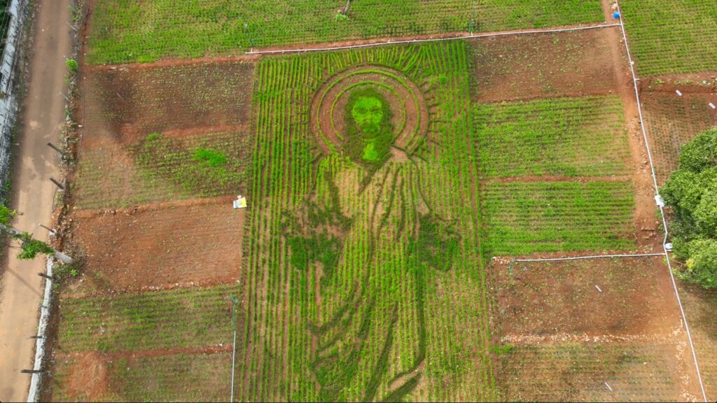 ചിത്രം വരച്ചിരിക്കുന്നത് പോലെയുള്ള ഈ നെൽകൃഷി കൃഷിയിലൂടെ യേശുദേവനുള്ള സമർപ്പണവും ഉദ്ദേശിച്ചാണ് ചെയ്തിരിക്കുന്നത്. മലയാളത്തിന് നഷ്ടമായ പരമ്പരാഗത നെൽവിത്തുകൾ കൊണ്ടാണ് ഈ കരനെൽകൃഷി നടത്തിയത്. ആയുർവേദ ചികിത്സയുടെ അവിഭാജ്യ ഘടകമായ പരമ്പരാഗത നെൽവിത്തുകളായ രക്തശാലി മുതൽ കൊടുക്കണ്ണി വരെയുള്ള ഇരുപതോളം നെൽവിത്തുകളാണ് ഇവിടെ വിതച്ചിരിക്കുന്നത്. കണ്ണുകളുടെ ആരോഗ്യം നിലനിർത്താൻ, രക്തത്തിലെ പഞ്ചസാരയുടെ അളവ് നിയന്ത്രിക്കാൻ, ചർമ്മം മുതൽ പേശികൾ വരെയുള്ള ആരോഗ്യത്തിന് ഒക്കെ അനുയോജ്യമായതാണ് ഈ നാടൻ നെൽവിത്തുകൾ. നാടൻ പശുക്കളുടെ ചാണകവും, മൂത്രവും അടക്കമുള്ള ജൈവ വളങ്ങളാണ് വളമായി നൽകുന്നത്.