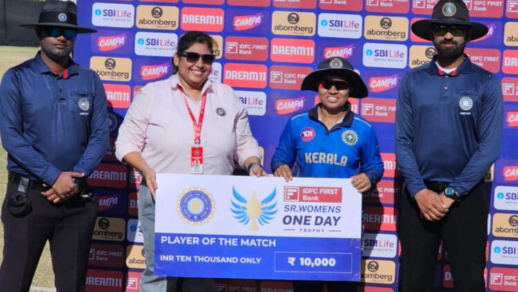 വലിയ ലക്ഷ്യത്തിലേക്ക് ബാറ്റ് വീശിയ നാഗാലന്റിന് ഒരു ഘട്ടത്തിലും മികച്ച പ്രകടനം പുറത്തെടുക്കാൻ കഴിഞ്ഞില്ല. മുൻനിര ബാറ്റർമാരെയെല്ലാം പുറത്താക്കി കീർത്തി ജെയിംസാണ് നാഗാലന്റ് ബാറ്റിംഗ് നിരയെ തകർത്തത്. അഞ്ച് ബാറ്റർമാരെയും ക്ലീൻ ബൗൾഡാക്കിയായിരുന്നു കീർത്തിയുടെ അഞ്ച് വിക്കറ്റ് നേട്ടം. ക്യാപ്റ്റൻ ഷാനി മൂന്ന് വിക്കറ്റുകളും മൃദുല ഒരു വിക്കറ്റും വീഴ്ത്തി. 30.2 ഓവറിൽ വെറും 92 റൺസിന് നാഗാലന്റ് ഓൾ ഔട്ടായി. 25 റൺസെടുത്ത സെന്റിലെംലയാണ് നാഗാലന്റിന്റെ ടോപ് സ്കോറർ.