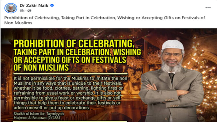 ക്രിസ്മസ് ആഘോഷത്തെ ലക്ഷ്യം വച്ച് വിവാദ ഇസ്ലാമത പ്രഭാഷകൻ സാക്കിർ നായിക്കിന്റ ഫേസ്ബുക്ക് പോസ്റ്റ്. അമുസ്ലീങ്ങളുടെ ആഘോഷങ്ങളിൽ പങ്കെടുക്കുന്നതും എതെങ്കിലും തരത്തിൽ ഭാഗമാകുന്നതും മത വിരുദ്ധമാണെന്നാണ് പോസ്റ്റിന്റെ ഉള്ളടക്കം.