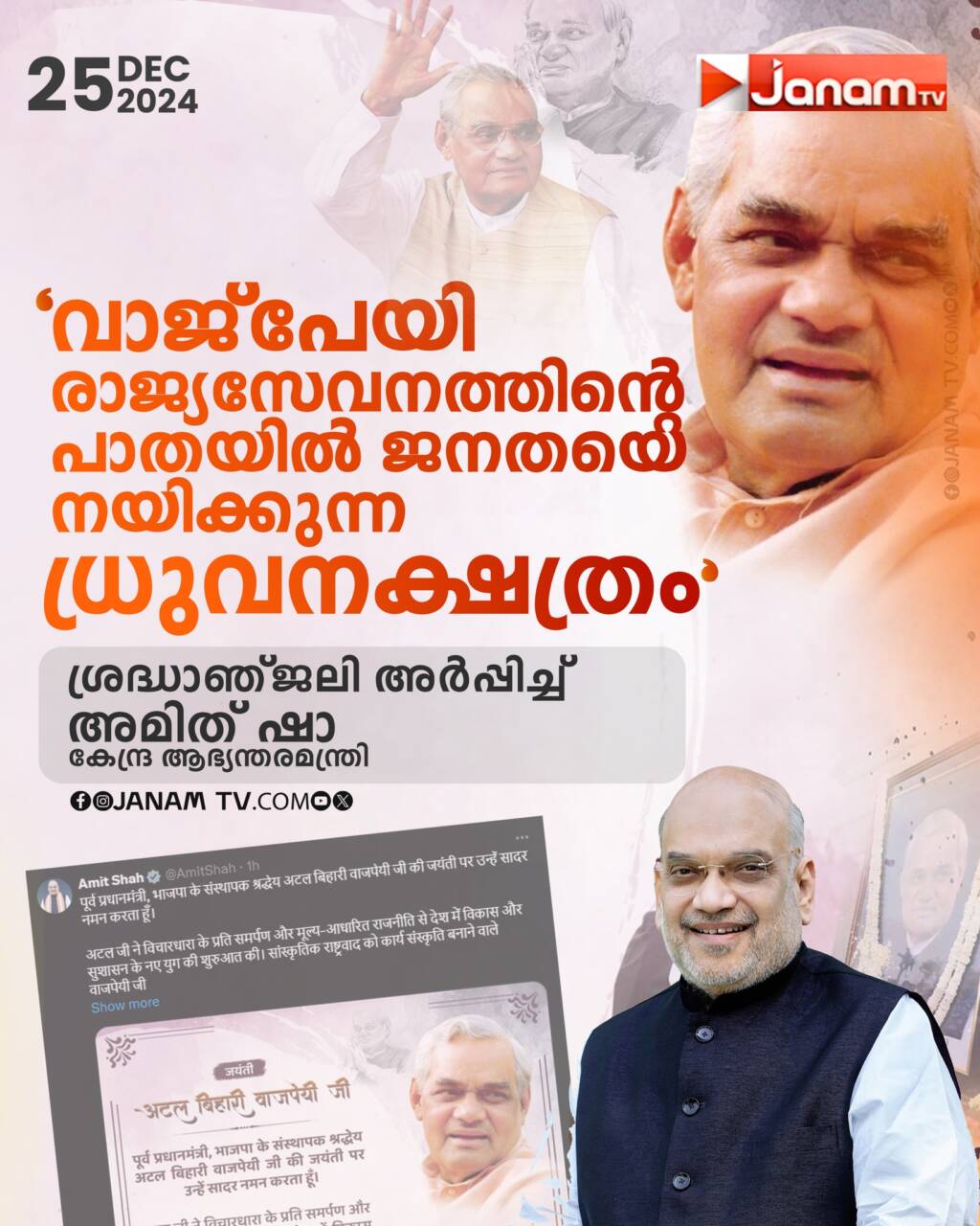 ഭരണജ്ഞൻ, കവി, നയതന്ത്രജ്ഞൻ, സ്വാതന്ത്ര്യ സമര സേനാനി എന്നീ നിലകളിൽ വ്യക്തി മുദ്രപതിപ്പിച്ച അടൽ ബിഹാരി വാജ്പേയി സർവ്വ സമ്മതനായിരുന്ന നേതാവായിരുന്നു. ആർഎസ്എസ് പ്രചാരകനിൽ തുടങ്ങി ഇന്ത്യൻ പ്രധാനമന്ത്രിവരെയെത്തിയ പതിറ്റാണ്ടുകൾ നീളുന്ന പൊതുജീവീതം രാജ്യത്തിന് നൽകിയ സംഭാവനകൾ വിലമതിക്കാനാകാത്തതാണ്. പ്രധാനമന്ത്രി എന്ന നിലയിൽ അദ്ദേഹം നടത്തിയ ഇടപെടലുകൾ രാജ്യാന്തര സമൂഹത്തിന്റെ പ്രശംസ പിടിച്ചുപറ്റി. കാർഗിൽ യുദ്ധം, ആണവ പരീക്ഷണം എന്നീ നിർണായ ഘട്ടങ്ങളിൽ അദ്ദേഹം സ്വീകരിച്ച ഉറച്ച നിലപാടുകൾ രാജ്യത്തിന്റെ സ്വാഭിമാനം ഉയർത്തിക്കാട്ടുന്നതായിരുന്നു.