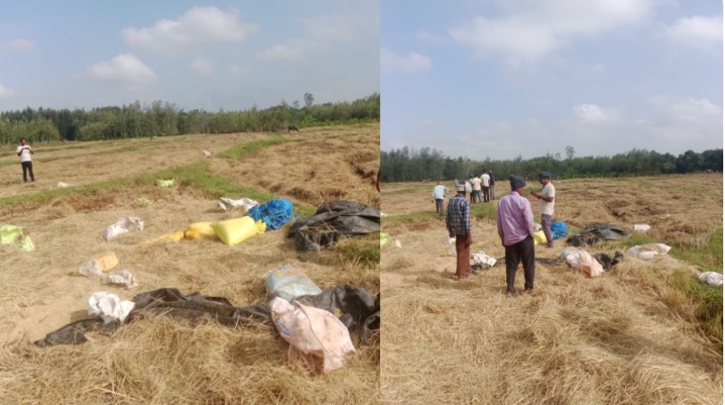 ഹാസൻ: നെൽക്കൃഷിയുടെ വിളവെടുപ്പ് കഴിഞ്ഞ് നെല്ല് വേർതിരിച്ച് ചാക്കുകളിലാക്കി സൂക്ഷിച്ചത് പാടശേഖരത്തിലെത്തിയ കാട്ടാനക്കൂട്ടം തിന്നു തീർത്തു. കർണാടകയിലെ ഹാസനിലാണ് സംഭവം. ബേലൂർ താലൂക്കിലെ ദേവലാപൂർ ഗ്രാമത്തിൽ നെല്ല് കൊയ്തെടുത്ത് വേർതിരിച്ച് കൊണ്ടുപോകാൻ വയലിൽ സൂക്ഷിച്ചിരിക്കുകയായിരുന്നു. ഇത് ഏതാണ്ട് 60 ക്വിൻ്റൽ വരുമായിരുന്നു. തൊട്ടടുത്ത ദിവസം ട്രാക്ടറിൽ കയറ്റി കൊണ്ടുപോകാനായിരുന്നു പദ്ധതി.