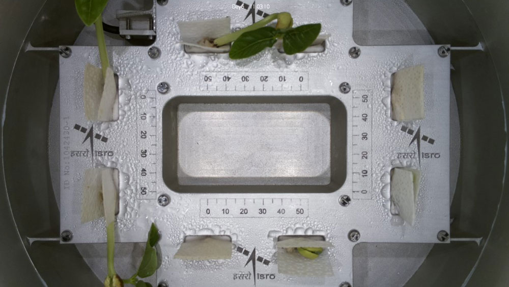ഗുരുത്വാകർഷണബലം ഇല്ലാത്ത ബഹിരാകാശത്ത് നാല് ദിവസം കൊണ്ട് പയർ വിത്ത് മുളപ്പിച്ച് ഇസ്രോ പുതുചരിമെഴുതിയിരുന്നു. ഇതിന് പിന്നാലെ ഇലകൾ കിളർ‌ത്ത വാർത്തയാണ് ഐഎസ്ആർഒ പുറത്തുവിടുന്നത്.