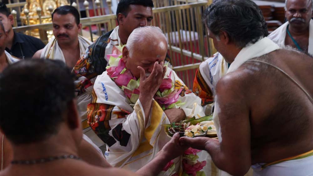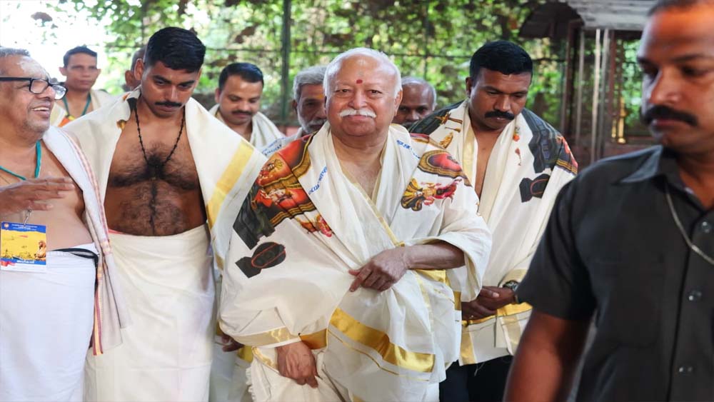 കൊച്ചി: ആർഎസ്എസ് സർസംഘചാലക് ഡോ. മോഹൻ ഭാഗവത് തൃപ്പൂണിത്തുറ ആമേട ക്ഷേത്രത്തിൽ ദർശനം നടത്തി. ക്ഷേത്ര ഭാരവാഹികൾ ഉപഹാരം നൽകി അദ്ദേഹത്തെ സ്വീകരിച്ചു. ശില്പം നിർമ്മിച്ച എം. എൽ. രമേശിനെ സർസംഘചാലക് അനുമോദിച്ചു.