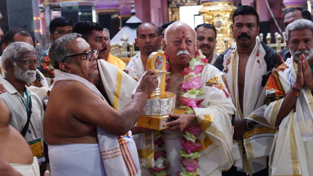 കൊച്ചി: ആർഎസ്എസ് സർസംഘചാലക് ഡോ. മോഹൻ ഭാഗവത് തൃപ്പൂണിത്തുറ ആമേട ക്ഷേത്രത്തിൽ ദർശനം നടത്തി. ക്ഷേത്ര ഭാരവാഹികൾ ഉപഹാരം നൽകി അദ്ദേഹത്തെ സ്വീകരിച്ചു. ശില്പം നിർമ്മിച്ച എം. എൽ. രമേശിനെ സർസംഘചാലക് അനുമോദിച്ചു.