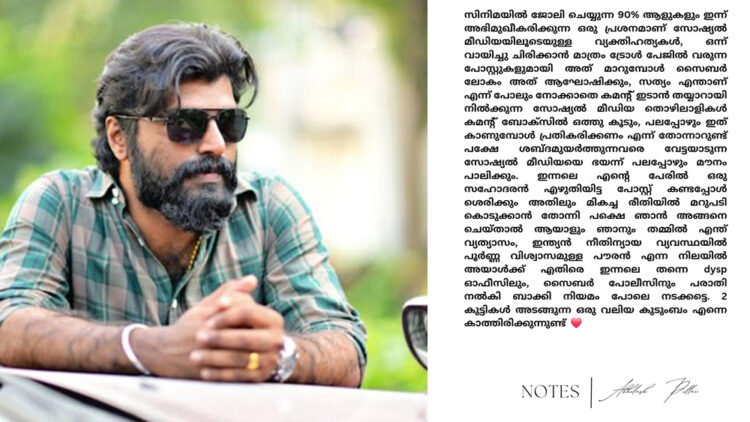 സത്യം എന്താണെന്ന് പോലും മനസിലാക്കാതെ ചിലർ കമന്റ് ബോക്സിൽ ഒത്തുകൂടുമ്പോൾ പ്രതികരിക്കാൻ തോന്നാറുണ്ടെന്നും എന്നാൽ ശബദ്മുയർത്തുന്നവരെ വേട്ടയാടുന്ന സോഷ്യൽമീഡിയയെ ഭയന്ന് മൗനം പാലിക്കുകയാണ് ചെയ്യുന്നതെന്നും അഭിലാഷ് പിള്ള ഫെയ്സ്ബുക്കിൽ കുറിച്ചു. സിനിമയിൽ ജോലി ചെയ്യുന്ന 90 ശതമാനം ആളുകളും സോഷ്യൽ മീഡിയയിലൂടെയുള്ള വ്യക്തിഹത്യകൾ നേരിടുന്നവരാണെന്നും കുറിപ്പിൽ പറയുന്നു.