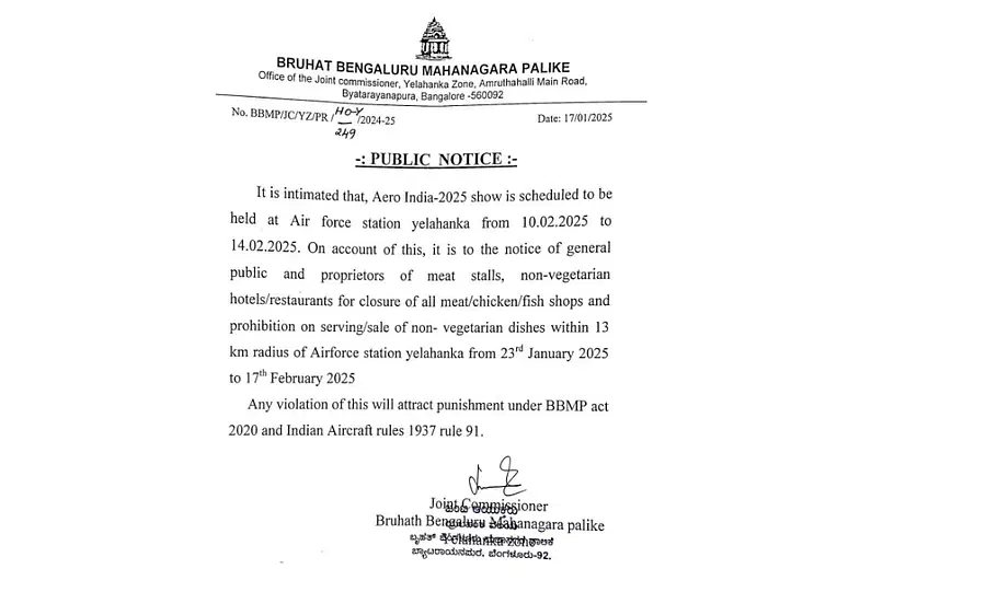യെലഹങ്ക എയർഫോഴ്സ് സ്റ്റേഷന്റെ 13 കിലോമീറ്റർ റേഞ്ചിലാണ് നോൺ-വെജ് ഭക്ഷണങ്ങളുടെ വിതരണവും വിപണിയും പൂർണമായും വിലക്കിയത്. ജനുവരി 23 മുതൽ ഫെബ്രുവരി 17 വരെയാണ് നിരോധനം. മുൻകരുതൽ നടപടിയുടെ ഭാഗമായാണ് ഇത്തരമൊരു നീക്കമെന്ന് BBMP അറിയിച്ചു.
