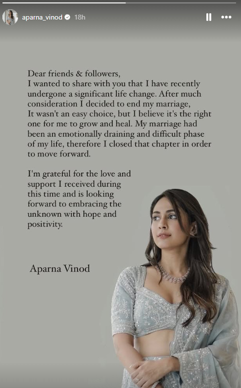 എന്റെ വിവാഹം വൈകാരികമായി എന്നെ തളർത്തിയ ജീവിതത്തിലെ ഒരു ഘട്ടമായിരുന്നു. അതുകൊണ്ട് ജീവിതത്തിലെ മുന്നോട്ട് പോക്കിനായി ഞാൻ ആ അധ്യായം ഞാൻ അടച്ചു.—എന്നും നടി ഇസ്റ്റഗ്രാമിൽ കുറിച്ചു. ഈ സമയത്ത് ലഭിച്ച പിന്തുണയ്ക്കും സ്നേഹത്തിനും നന്ദി പറയുന്നതായും അപർണ കുറിച്ചു. കോഹിനൂർ എന്ന അസിഫ് അലി ചിത്രത്തിലൂടെ സുപരിചിതയായ നടി വിജയ് ചിത്രം ഭൈരവയിലും അഭിനിയച്ചിരുന്നു.