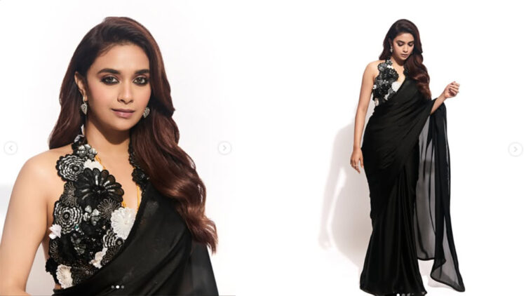 അതിമനോഹരമായ പ്ലെയിൻ ബ്ലാക്ക് ഷിഫോൺ സാരിക്ക് സിൽവർ-ബ്ലാക്ക് കോമ്പിനേഷനിൽ വരുന്ന ഫ്ലോറൽ സ്ലീവ്-ലെസ്സ് ബ്ലൗസാണ് കീർത്തി ധരിച്ചിരിക്കുന്നത്. ഡീപ് വി-നെക്ക് ആണ് ബ്ലൗസിന്. ഇതിൽ നിറയെ പൂക്കളുടെ ഡിസൈനും കാണാം. ബ്ലാക്ക് സാരിക്ക് ഡയമണ്ട് ആക്സസറീസാണ് കീർത്തി അണിഞ്ഞത്. ഡയമണ്ട് കമ്മലും മോതിരവുമുണ്ട്. എന്നാൽ കഴുത്തിൽ തന്റെ സുവർണ-മം​ഗൾസൂത്ര മാത്രമേ ധരിച്ചിട്ടുള്ളൂ.
