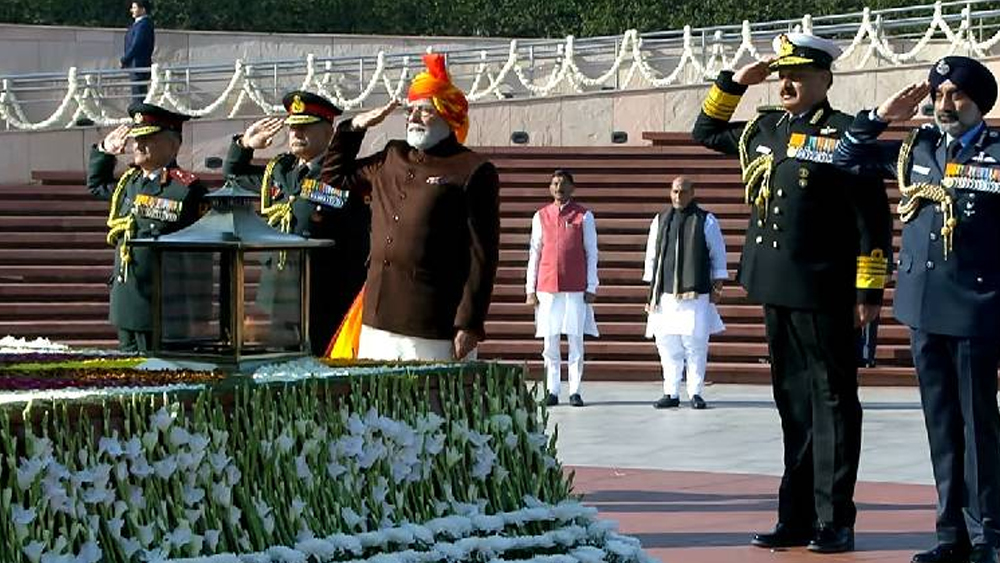 ന്യൂഡൽഹി: റിപ്പബ്ലിക് ദിനാഘോഷങ്ങൾക്ക് തുടക്കം കുറിച്ച് ഇന്ത്യാഗേറ്റിലെ ദേശീയ യുദ്ധസ്മാരകത്തിലെത്തി പ്രധാനമന്ത്രി നരേന്ദ്രമോദി. പ്രധാനമന്ത്രി രാജ്യത്തിനായി ജീവൻ ബലിയർപ്പിച്ച ധീരജവാന്മാർക്ക് ആദരമർപ്പിച്ച് അദ്ദേഹം യുദ്ധസ്മാരകത്തിൽ പുഷ്പചക്രം അർപ്പിച്ചു. കേന്ദ്ര പ്രതിരോധമന്ത്രി രാജ്നാഥ് സിംഗും പ്രധാനമന്ത്രിക്കൊപ്പം എത്തിയിരുന്നു.