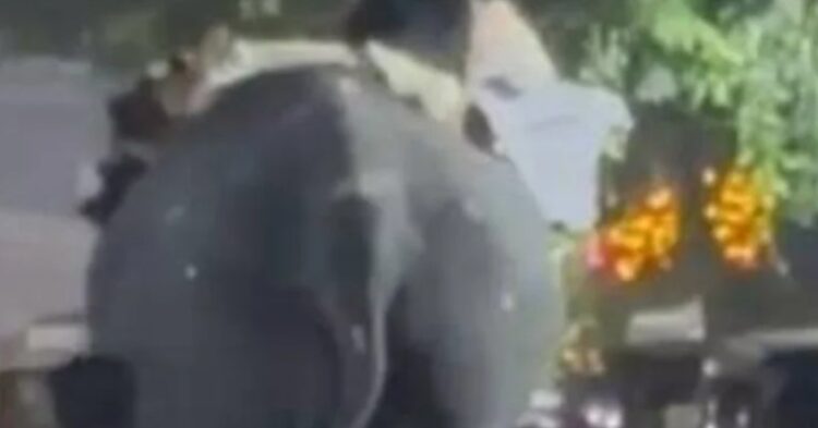 മൂന്നുപേരായിരുന്നു ആനപ്പുറത്ത് ഉണ്ടായിരുന്നത്. ഇതിലൊരാൾ സമീപത്തുള്ള ഓട്ടോറിക്ഷയുടെ മുകളിലേക്ക് ചാടിരക്ഷപ്പെട്ടു. മറ്റു രണ്ടുപേരെ ആന കുടഞ്ഞെറിഞ്ഞു. ഒരാൾ ആനയുടെ കൊമ്പിൽ തട്ടി കാൽച്ചുവട്ടിലേക്ക് വീണ് പരിക്കേറ്റു. സ്ഥലത്തുണ്ടായിരുന്നവർ ബഹളംവെച്ച് ആനയുടെ ശ്രദ്ധ തിരിച്ചതിനാൽ ഇയാൾ അദ്ഭുതകരമായി രക്ഷപ്പെട്ടു. റോഡിൽ വീണ മൂന്നാമൻ ഓടിരക്ഷപ്പെട്ടു.