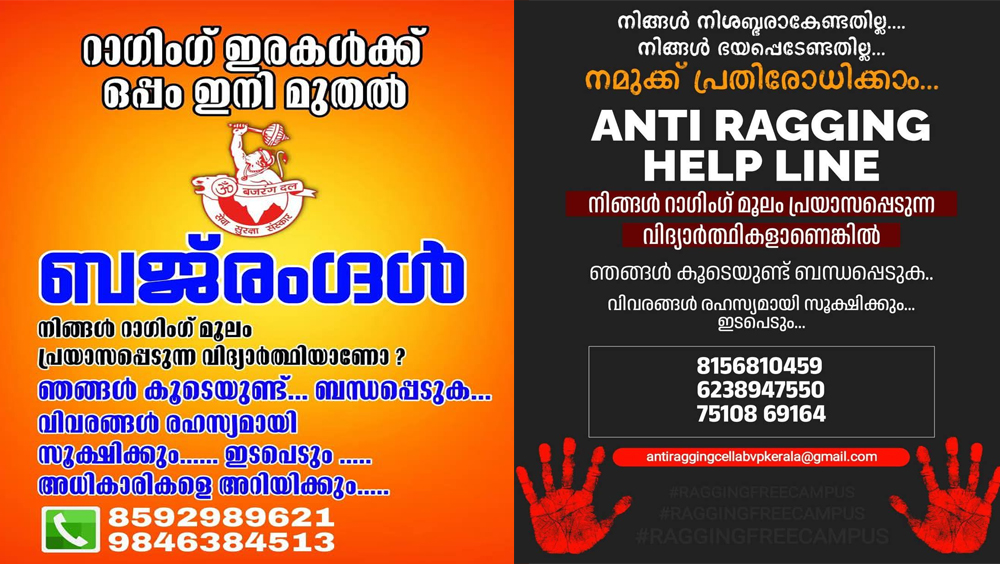 ഇത് കൂടാതെ ബജ്രംഗദൾ കേരളം ഘടകവും റാഗിംഗിനെതിരെ രംഗത്തു വന്നിട്ടുണ്ട്. റാഗിംഗ് മൂലം പ്രയാസപ്പെടുന്ന വിദ്യാർത്ഥികൾക്ക് ബന്ധപ്പെടാനുള്ള നമ്പറുകൾ ബജ്രംഗദൾ നൽകിയിട്ടുണ്ട്. നൽകുന്ന വിവരങ്ങൾ രഹസ്യമായി സൂക്ഷിക്കും എന്നും വിഷയത്തിൽ ഇടപെടും എന്നും അധികാരികളെ അറിയിക്കും എന്നും ബജ്രംഗദൾ വാഗ്ദാനം ചെയ്യുന്നു.