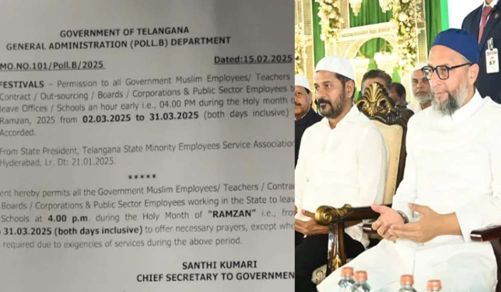 തെലങ്കാനയിലെ കോൺഗ്രസ് സർക്കാർ. മുസ്ലീം വിഭാഗത്തിൽ പെട്ട സർക്കാർ ജീവനക്കാരുടെ പ്രവൃത്തി സമയം നാല് മണിവരെയാക്കി.