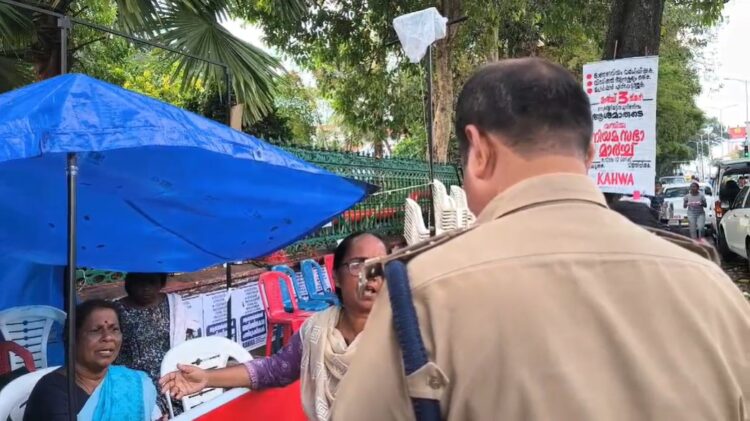 മഴ നനയാതിരിക്കാൻ പിടിച്ച ടാർപോളിൻ നീക്കം ചെയ്യണമെന്ന് സെക്രട്ടേറിയറ്റിന് മുന്നിൽ സമരം ചെയ്യുന്ന ആശാ വർക്കർമാരോട് പൊലീസ് ആവശ്യപ്പെടുകയായിരുന്നു.
