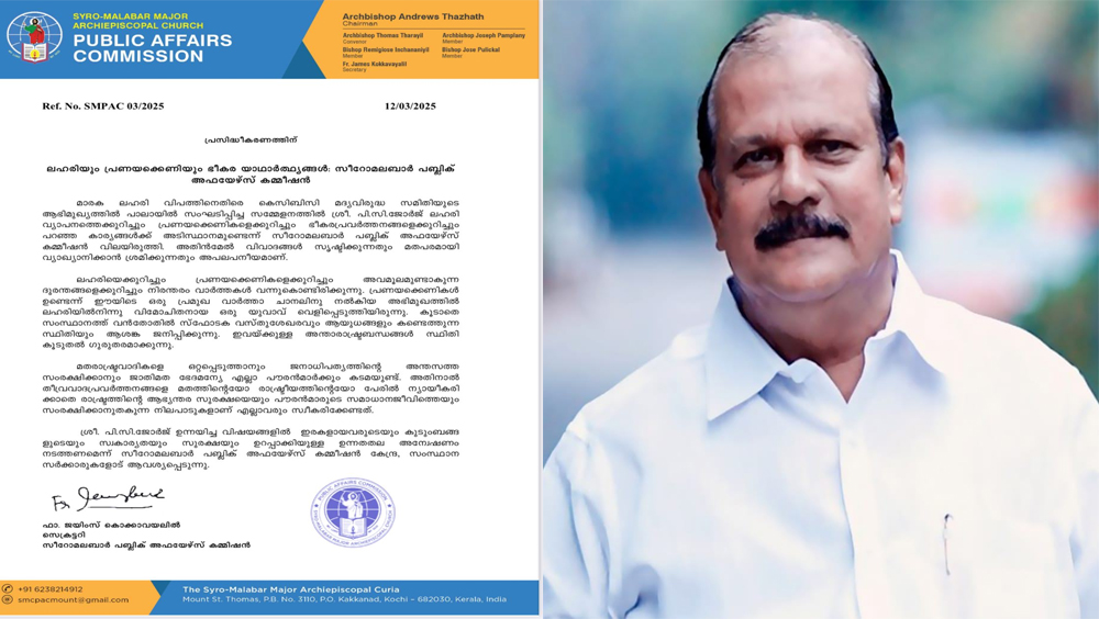 മാരക ലഹരി വിപത്തിനെതിരെ കെസിബിസി മദ്യവിരുദ്ധ സമിതിയുടെ ആഭിമുഖ്യത്തില് പാലായില് സംഘടിപ്പിച്ച സമ്മേളനത്തില് ശ്രീ. പി.സി. ജോര്ജ് ലഹരി വ്യാപനത്തെക്കുറിച്ചും പ്രണയക്കെണികളെക്കുറിച്ചും ഭീകരപ്രവര്ത്തനങ്ങളെക്കുറിച്ചും പറഞ്ഞ കാര്യങ്ങള്ക്ക് അടിസ്ഥാനമുണ്ടെന്ന് സിറോമലബാര് പബ്ലിക് അഫയേഴ്സ് കമ്മീഷന് വിലയിരുത്തി. അതിന്മേല് വിവാദങ്ങള് സൃഷ്ടിക്കുന്നതും മതപരമായി വ്യാഖ്യാനിക്കാന് ശ്രമിക്കുന്നതും അപലപനീയമാണ്.