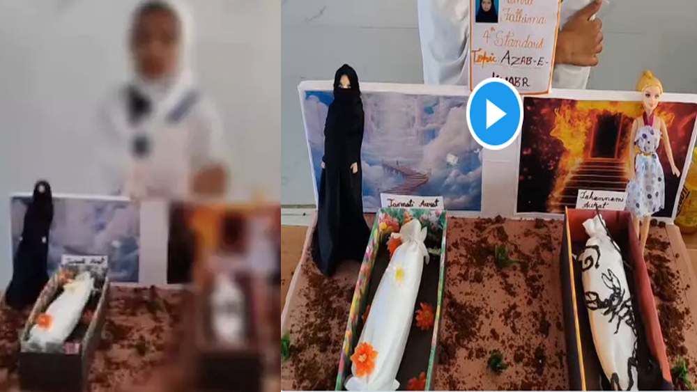” ഹലോ, എന്റെ പേര്….. ഞാൻ നാലാം ക്ലാസ്സിൽ പഠിക്കുന്നു. ഇന്നത്തെ എന്റെ വിഷയം ഖബറിനുള്ളിലെ ശിക്ഷയാണ്. ബുർഖ ധരിച്ചാൽ മരണശേഷം ശരീരത്തിന് ഒന്നും സംഭവിക്കില്ലെന്നും, സാധാരണ വസ്ത്രം ധരിച്ചാൽ നരകത്തിൽ പോകുമെന്നും, ശരീരം പാമ്പുകളും തേളുകളും തിന്നുതീർക്കുമെന്നും അള്ളാഹു പറയുന്നു