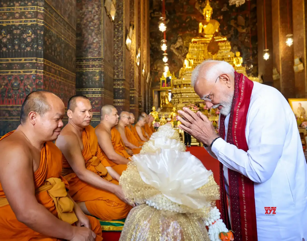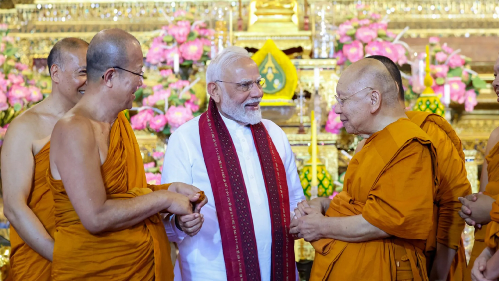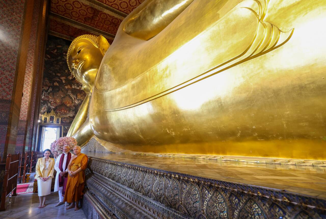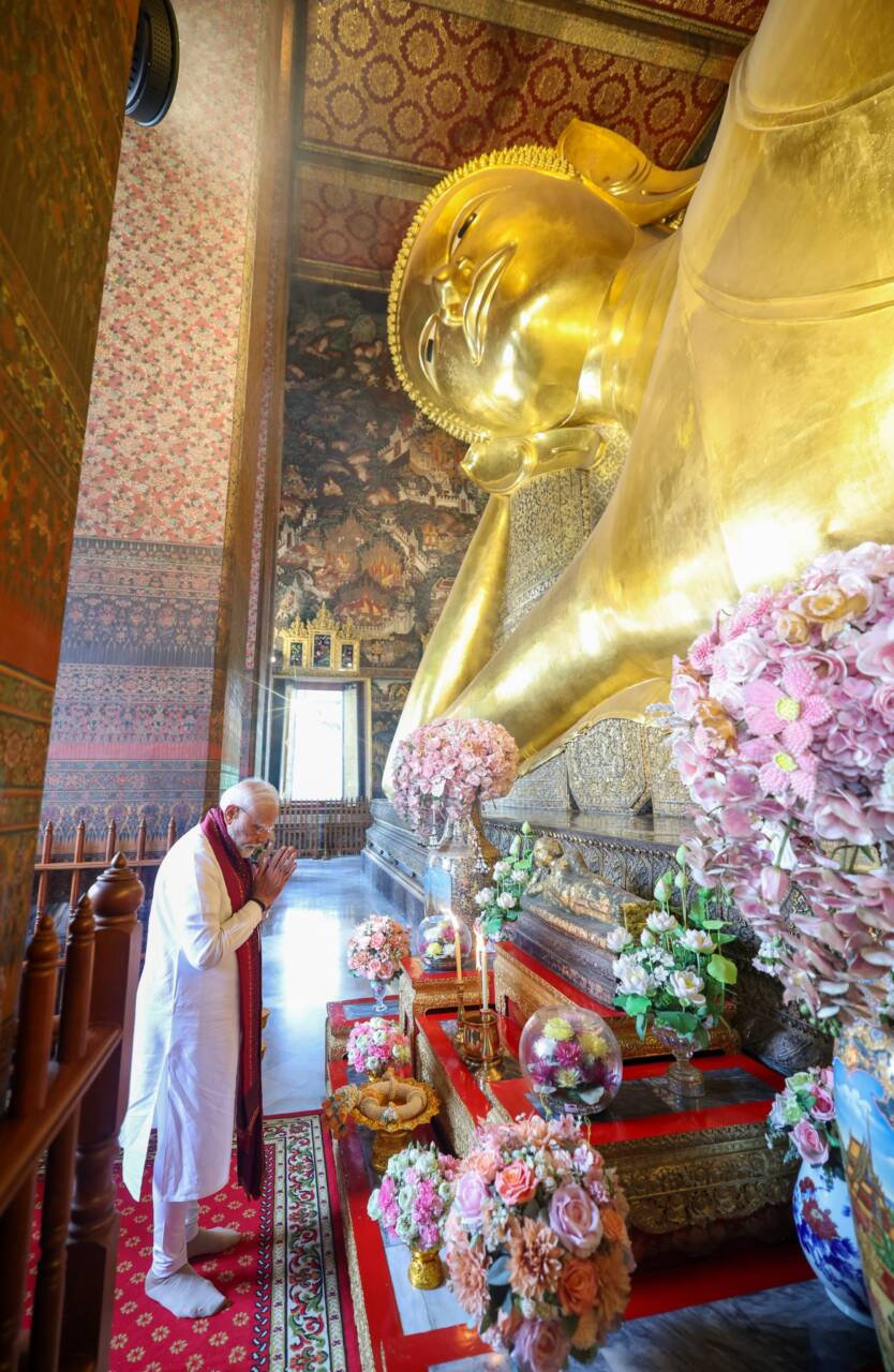 ബാങ്കോക്കിലെ ബുദ്ധ ക്ഷേത്രം സന്ദർശിച്ച് പ്രധാനമന്ത്രി, സന്യാസിമാർക്ക് അശോകൻ സ്തംഭത്തിന്റെ മാതൃക സമ്മാനിച്ച് മോദി; ചിത്രങ്ങൾ