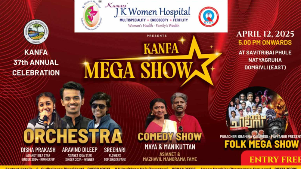 കണ്ണൂർ: ഫ്രണ്ട്സ് അസോസിയേഷൻ ഡോംബിവിലിയുടെ 37-ാമത് വാർഷികത്തിന്റെ ഭാഗമായി കാൻഫ മെഗാ ഷോ നടക്കും. ഇന്ന് വൈകുന്നേരം അഞ്ച് മണി മുതൽ ഡോംബിവ്ലി ഈസ്റ്റിലുള്ള സാവിത്രി ഭായ് ഫുലെ ഓഡിറ്റോറിയത്തിൽ വച്ചാണ് പരിപാടി നടക്കുന്നത്.
