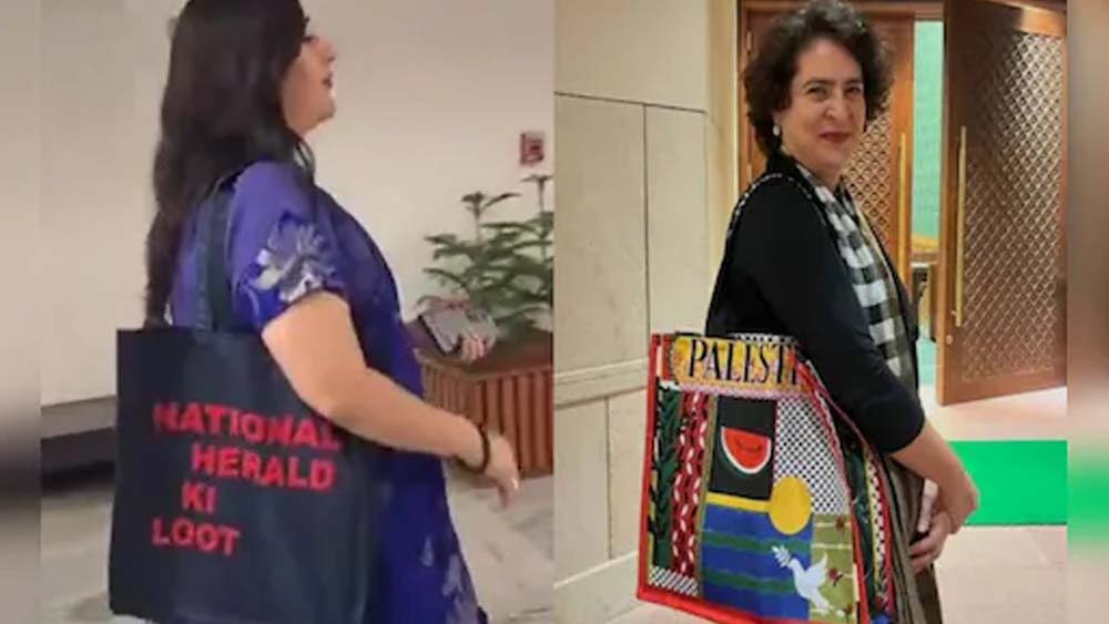 ഒരു രാജ്യം ഒരു തിരഞ്ഞെടുപ്പുമായി ബന്ധപ്പെട്ട യോഗമാണ് പാർലമെന്റിൽ  നടന്നത്. നീല നിറമുള്ള ബാ​ഗിൽ ചുവപ്പ് നിറത്തിലാണ് ‘നാഷണൽ ഹെറാൾഡ് കൊള്ള’ എന്ന് രേഖപ്പെടുത്തിയത്. പൊളിക്കൽ സ്റ്റേറ്റ്മെന്റായി ബാ​ഗ് കൊണ്ടുനടക്കുന്നയാളാണ് പ്രിയങ്ക വാദ്ര. അടുത്തിടെ പലസ്തീന് പിന്തുണച്ച് തണ്ണിമത്തൻ ബാ​ഗുമായി പ്രിയങ്ക പാർലമെന്റിൽ എത്തിയിരുന്നു. ഇതിനുള്ള മറുപടി കൂടിയാണ് ബൻസുരി നൽകിയത്.