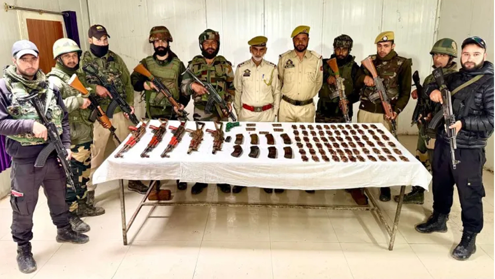 നിരവധി ആയുധങ്ങളും വെടിക്കോപ്പുകളും കണ്ടെത്തിയതായി സൈന്യം അറിയിച്ചു. 5 എകെ-47 റൈഫിളുകൾ, 8 എകെ-47 മാ​ഗസീനുകൾ, പിസ്റ്റൽ, പിസ്റ്റൽ മാ​ഗസീൻ, എകെ-47ന്റെ 660 തിരകൾ, തുടങ്ങി നിരവധി വെടിക്കോപ്പുകൾ സുരക്ഷാസേന പിടിച്ചെടുത്തു.
