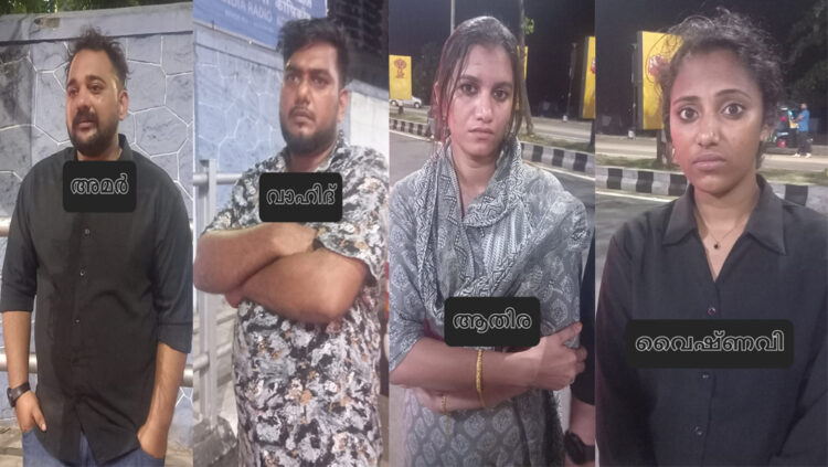 കോഴിക്കോട് കുറ്റ്യാടി സ്വദേശി വാഹിദ്, കണ്ണൂർ സ്വദേശികളായ അമർ, ആതിര, വൈഷ്ണവി എന്നിവരെയണ് പിടികൂടിയത്. സ്കൂൾ, കോളജുകൾ, ടറഫുകൾ തുടങ്ങി കുട്ടികളെയും യുവാക്കളെയും കേന്ദ്രീകരിച്ചാണ് ഇവരുടെ കൂടുതൽ വില്പന.