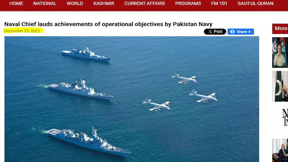 അറബിക്കടലിൽ അന്തർവാഹിനികൾ, കപ്പലുകൾ, വിമാനങ്ങൾ എന്നിവയുൾപ്പെടെയുള്ള തങ്ങളുടെ ഫ്ലീറ്റ് യൂണിറ്റുകളുടെ ദ്രുതഗതിയിലുള്ള വിന്യാസം അവകാശപ്പെട്ടുകൊണ്ട് പാക് നാവിക സേന മോർഫ് ചെയ്ത ചിത്രം പുറത്തിറക്കി. സംഘർഷ സമയത്തെ തങ്ങളുടെ ദ്രുതഗതിയിലുള്ള പ്രതികരണം കാണിക്കാൻ അവർ ഈ ചിത്രം ഒരു ഐഎസ്പിആർ പത്രസമ്മേളനത്തിൽ അവതരിപ്പിക്കുകയും ചെയ്തു. എന്നാൽ ഈ ചിത്രം പുതിയതല്ലെന്ന് കണ്ടെത്തിയിരിക്കുകയാണ് സൈബറിടം. 2023 മുൻപ് എടുത്ത് ചിത്രം ഇന്ത്യൻ മഹാസമുദ്രത്തിൽ ചൈന-പാകിസ്താൻ സംയുക്ത നാവിക അഭ്യാസത്തിനിടെ എടുത്തിട്ടുള്ളതാണ്.
