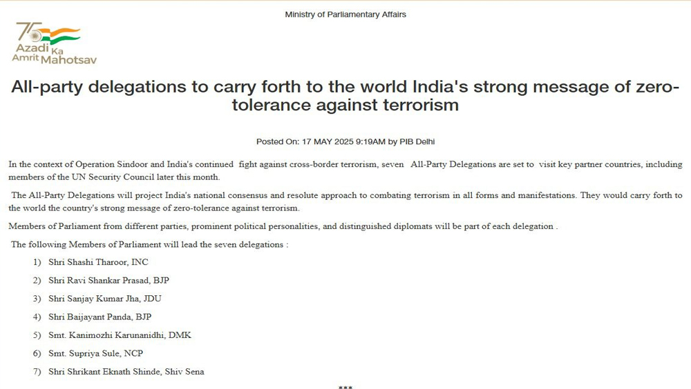 പാക് ഭീകരത ലോകത്തെ അറിയിക്കാൻ കേന്ദ്രം രൂപീകരിച്ച വിദേശ പര്യടന സർവകക്ഷിസംഘത്തിലെ അംഗങ്ങളുടെ പട്ടിക പുറത്തു വിട്ടു
