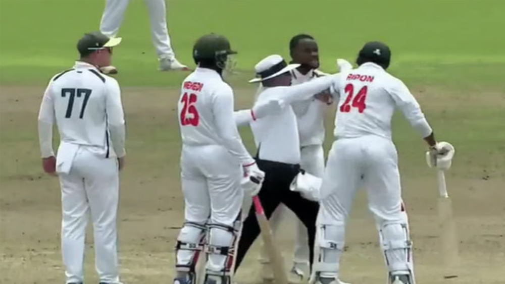 മൈതാനത്ത് വീറും വാശിയും കൊമ്പുകോർക്കലുമൊക്കെ സാധാരണ സംഭവമാണെങ്കിലും അടി പൊട്ടിയാലോ..! അതാണ് ധാക്കയിലെ ഒരു അനൗദ്യോഗിക ടെസ്റ്റിൽ സംഭവിച്ചത്. ദക്ഷിണാഫ്രിക്കൻ ബൗളർ ഷെപ്പോ ന്റുലിയും ബംഗ്ലാദേശ് ബാറ്റർ റിപോൺ മോണ്ടോളുമായിരുന്നു മൈതാനത്ത് ഏറ്റുമുട്ടിയത്.