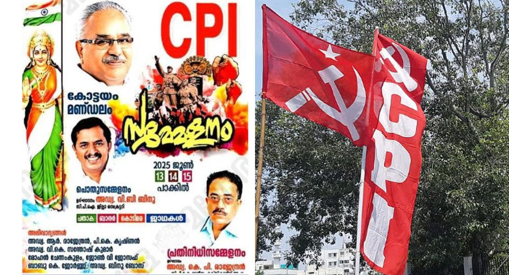 കോട്ടയം:ഭാരതാംബയുടെ ചിത്രം പതിപ്പിച്ച് മണ്ഡലം സമ്മേളന പോസ്റ്റർ ഇറക്കി സിപിഐ. പാർട്ടിയുടെ കോട്ടയം മണ്ഡലം സമ്മേളനത്തിന്റെ പോസ്റ്റർ ആണ് ഭാരതാംബയുടെ ചിത്രം പതിപ്പിച്ച് പ്രസിദ്ധീകരിച്ചത്. സമൂഹ്യമാധ്യമങ്ങളിൽ പ്രചരിപ്പിക്കാൻ വേണ്ടിയാണ് ഈ പോസ്റ്റർ തയ്യാറാക്കിയതെന്ന് പറയുന്നു. ഇത് പിന്നീട് പിൻവലിച്ചു.