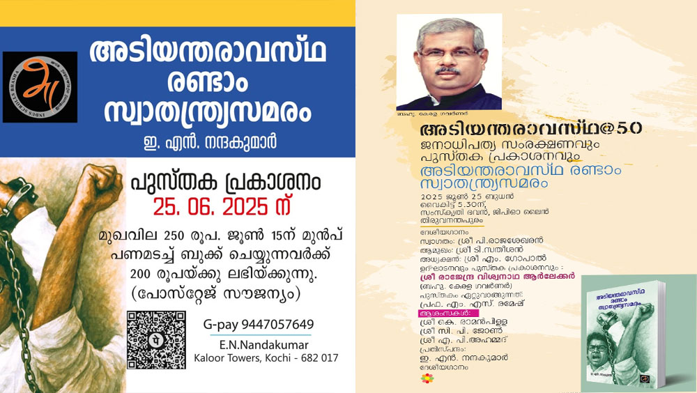 തിരുവനന്തപുരം: അടിയന്തരാവസ്ഥക്കെതിരെ കേരളത്തിലുണ്ടായ പ്രതിരോധങ്ങളുടെയും പോരാട്ടങ്ങളുടെയും ചരിത്രമായ “അടിയന്തരാവസ്ഥ രണ്ടാം സ്വാതന്ത്ര്യ സമരം” എന്ന പുസ്തകത്തിന്റെ പ്രകാശനം ജൂൺ 25 ന്. ഭാരതീയ വിചാരകേന്ദ്രത്തിൽ വെച്ച് നടക്കുന്ന ചടങ്ങിൽ കേരളാ ഗവർണ്ണർ രാജേന്ദ്ര വിശ്വനാഥ ആർലേക്കർ നിർവ്വഹിക്കും. വൈകുന്നേരം 5 .30 മണിക്കാണ് പുസ്തക പ്രകാശനം. പ്രഫ: എം. എസ്. രമേശാണ് പുസ്തകം ഏറ്റുവാങ്ങുന്നത്.