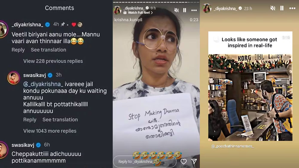 നടി സ്വാസികയും ദിയയെ പിന്തുണച്ച് കമന്റ് പങ്കുവച്ചിട്ടുണ്ട്. ചെപ്പാക്കുറ്റി അടിച്ച് പൊട്ടിക്കണമെന്നാണ് സ്വാസിക കുറിച്ചത്. അതേസമയം യുവതികൾ മൂന്നുപേരും ഒളിവിലാണെന്ന് പൊലീസ് സ്ഥിരീകരിച്ചു. ക്രൈം ബ്രാഞ്ചിന് അന്വേഷണം കൈമാറി.