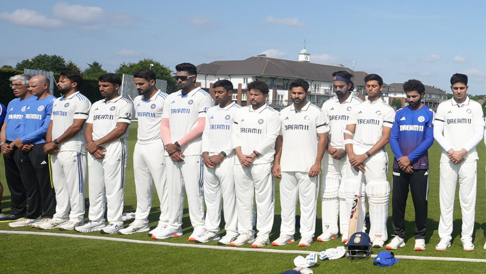 അഹമ്മദാബാദ് എയർ ഇന്ത്യാ വിമാന ദുരന്തത്തിൽ കൊല്ലപ്പെട്ടവർക്ക് ആദരാഞ്ജലിയർപ്പിച്ച് ഇന്ത്യൻ ക്രിക്കറ്റ് ടീം. ഇന്ത്യയും ഇന്ത്യ എയും തമ്മിലുള്ള നാല് ദിവസത്തെ ഇൻട്രാ-സ്ക്വാഡ് സന്നാഹ മത്സരത്തിന് മുന്നോടിയായി താരങ്ങൾ ഒരുനിമിഷത്തെ മൗനം ആചരിച്ചു. ഇരു രാജ്യങ്ങളും തമ്മിൽ ജൂൺ 20 ന് തുടങ്ങാനിരിക്കുന്ന 5 മത്സരങ്ങളുടെ ടെസ്റ്റ് പരമ്പരയ്‌ക്കായി നിലവിൽ ഇംഗ്ലണ്ടിലാണ് ടീം ഇന്ത്യ. ഇതിനുമുന്നോടിയായുള്ള പരിശീലന മത്സരത്തിലാണ് താരങ്ങൾ.